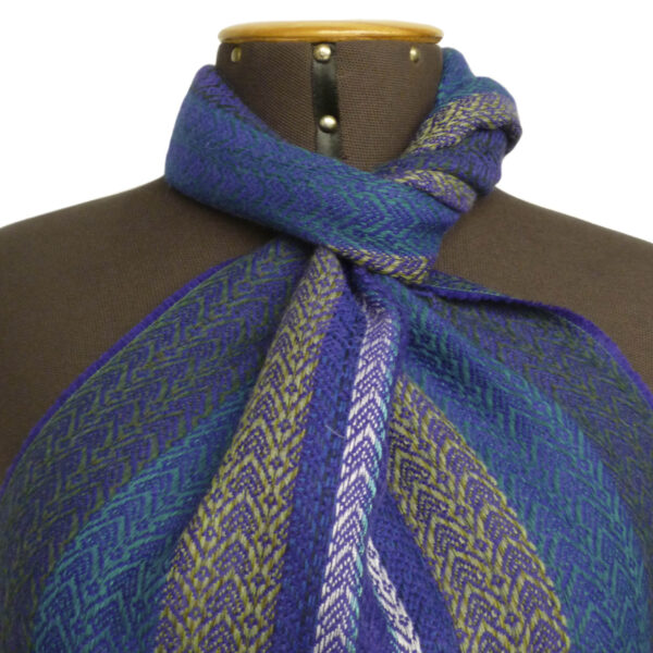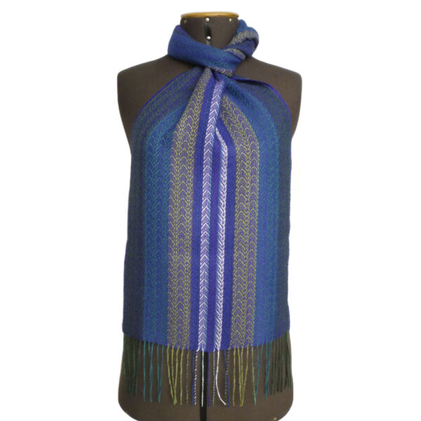Our radiant Abaco scarf presents us with a delight of oranges, violets and autumn greens with a delicate arrow pattern. The application of handmade fringes gives that fun and chic touch to the piece.