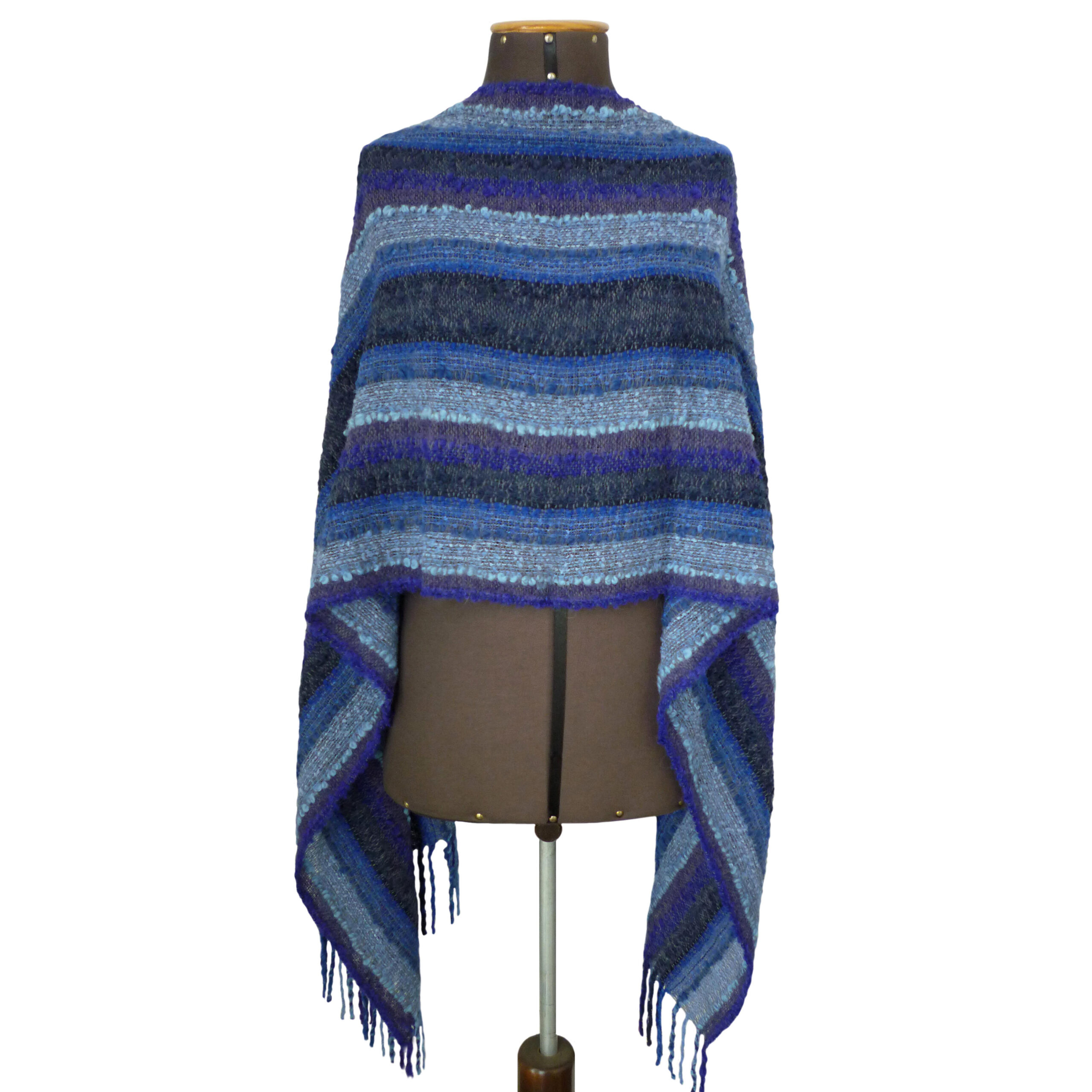 Our Jhair scarf is soft and comes in an exquisite array of vibrant blues. It’s hand-loomed with baby alpaca fiber and features hand-tufted fringes.
