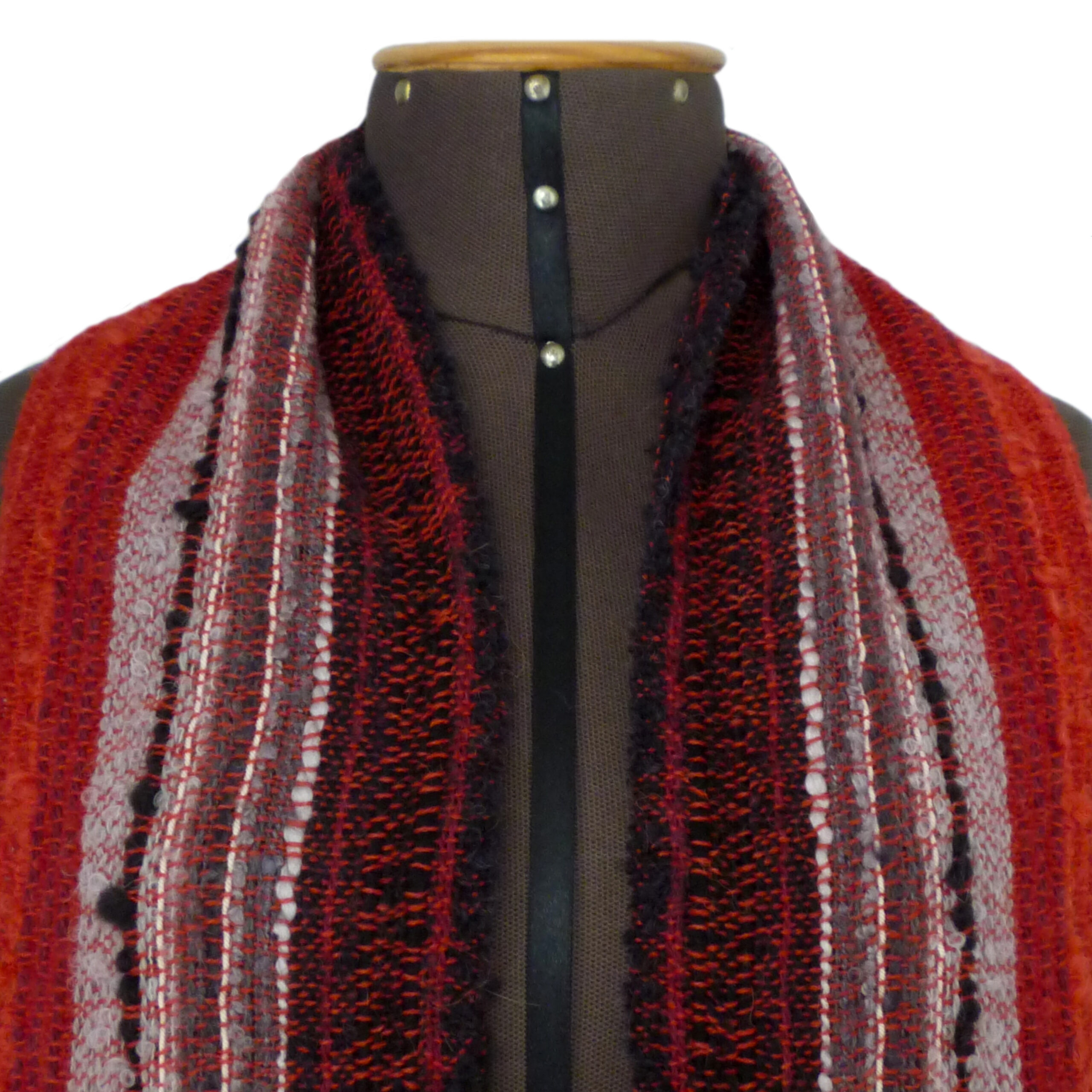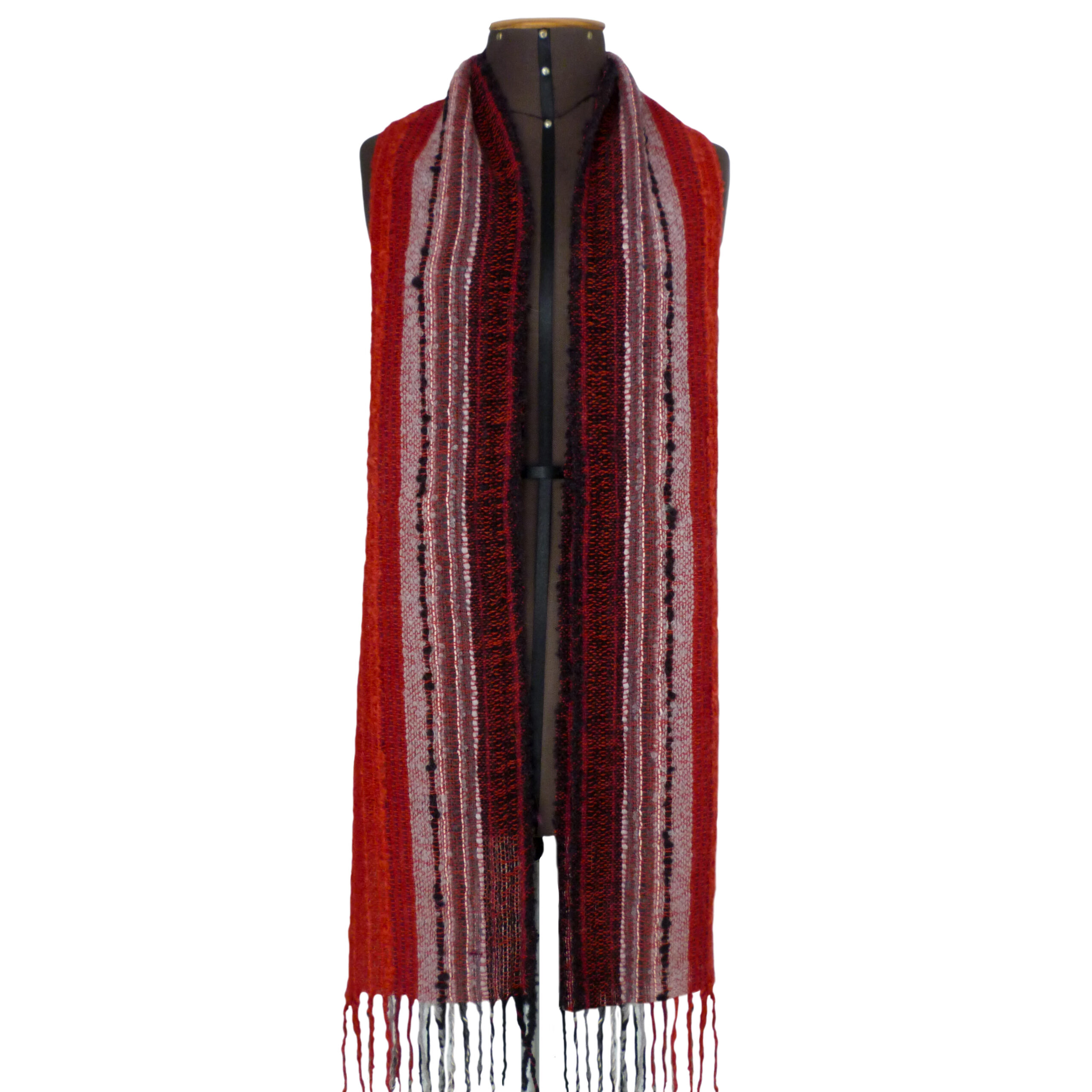 El dinamismo y la calidez se abren paso con nuestra chalina Chimbote. No lo dudes y disfruta de la riqueza de sus hilados en bouclé y de sus delicados flecos hechos a mano. Esta pieza esta trabajada en 100% baby alpaca.