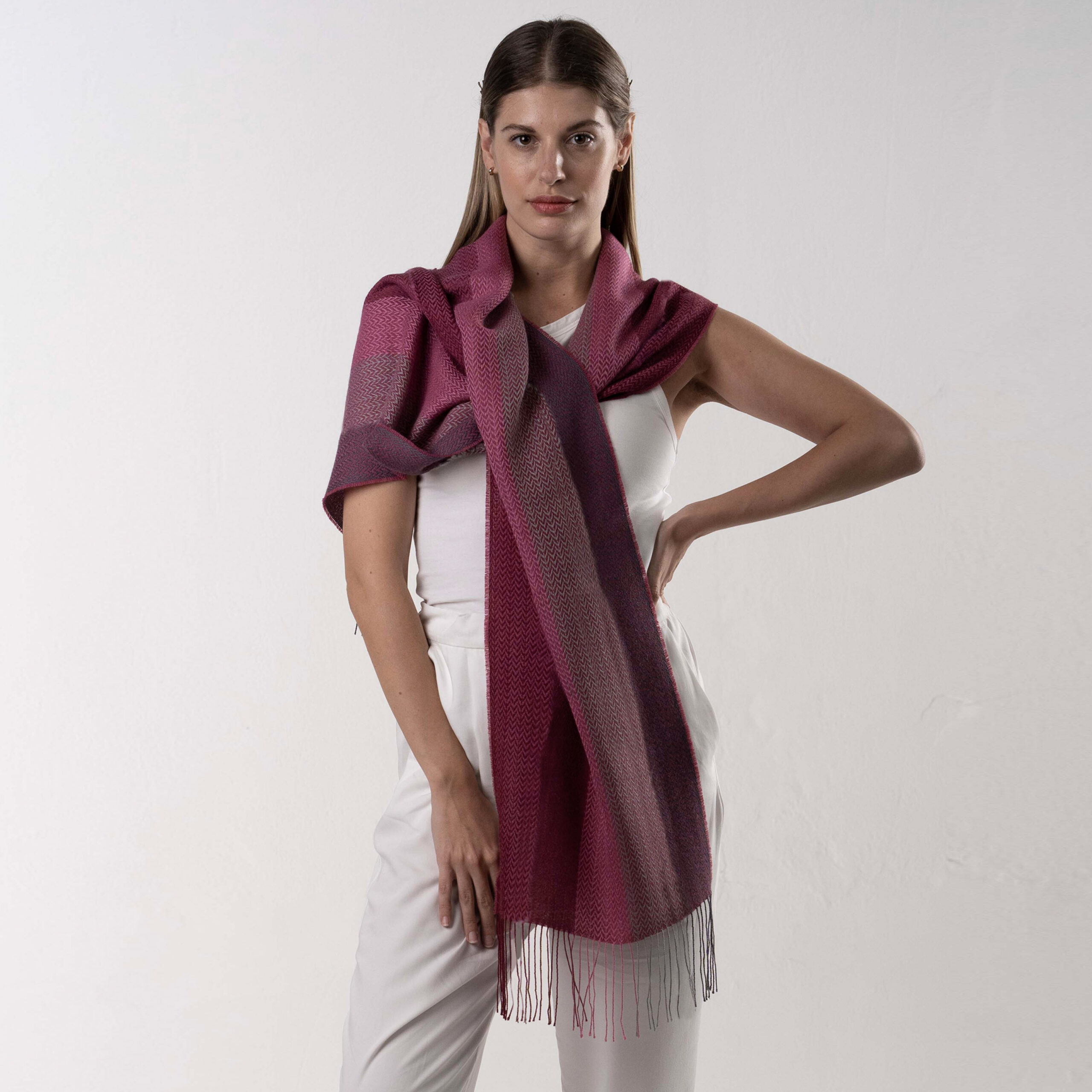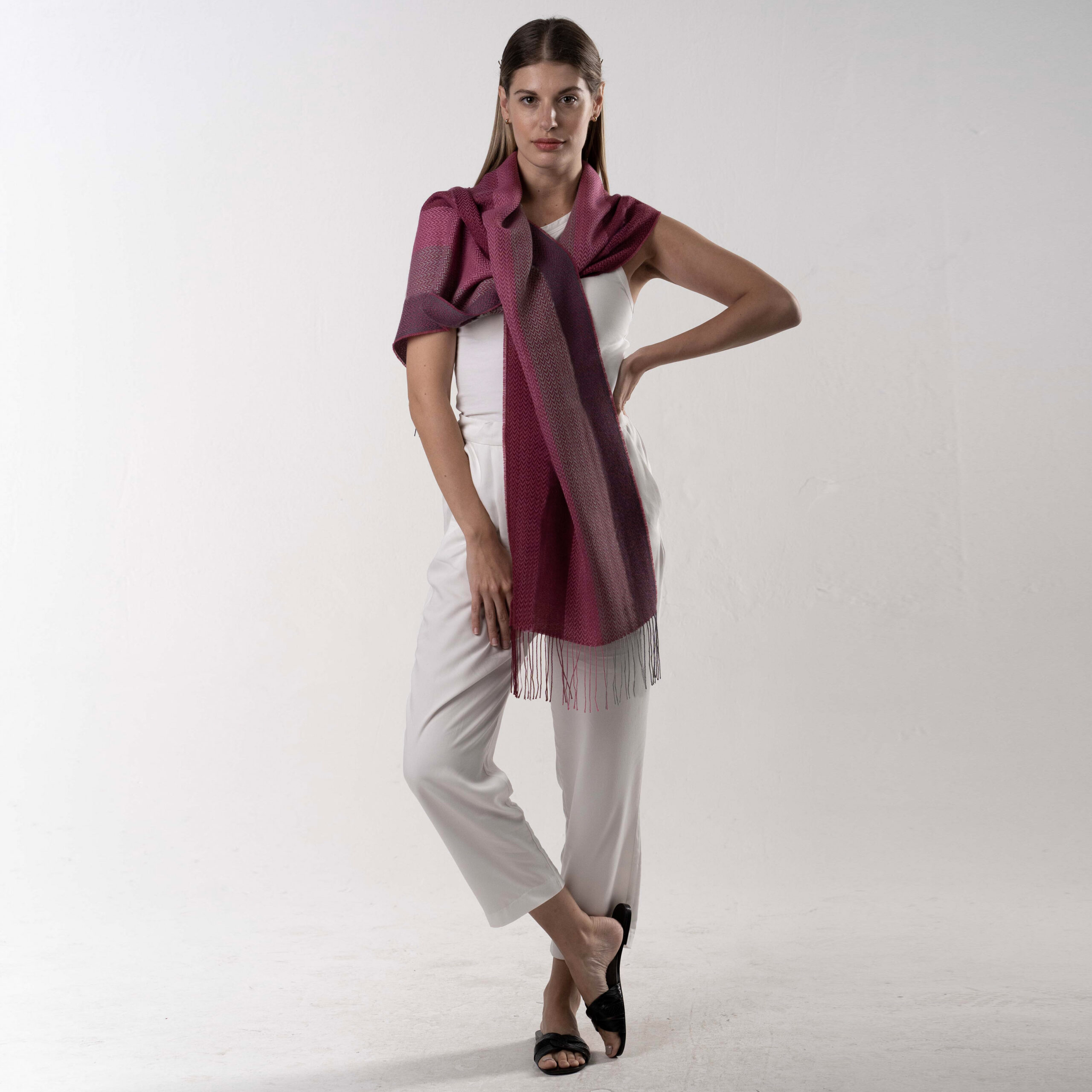 Nuestra radiante chalina Josefina nos presenta una exquisita gama de colores alegres. La aplicación de flecos hechos a mano le da ese toque divertido y chic a la pieza.