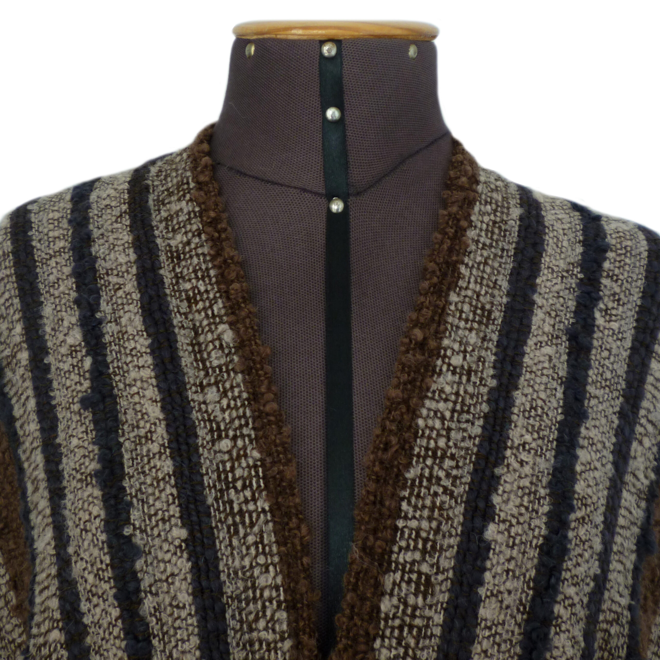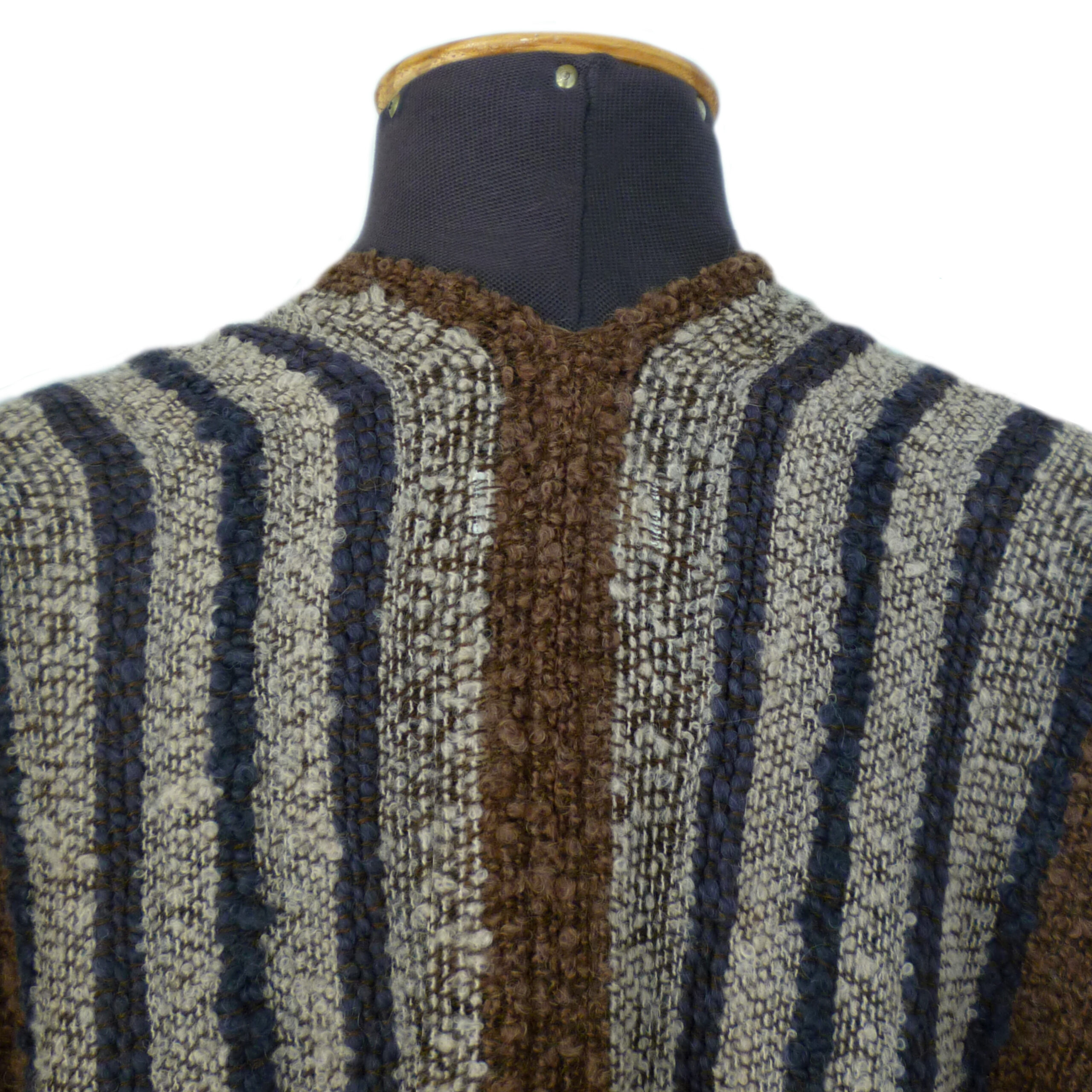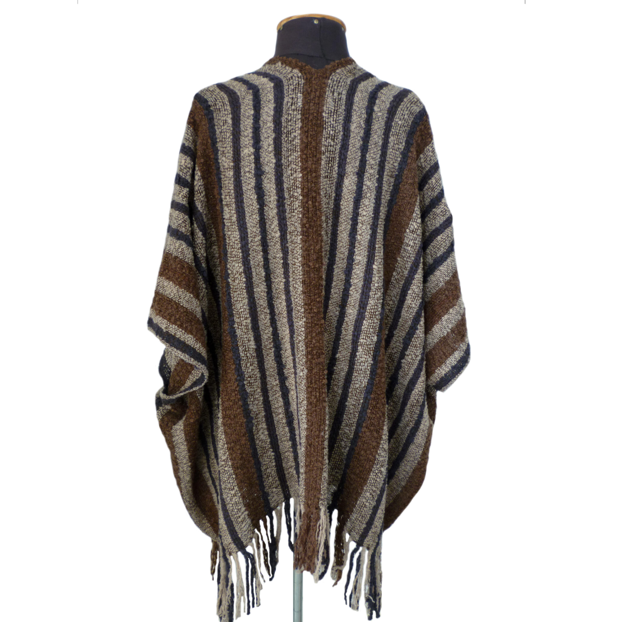 Nuestra capa josi se presenta en una elegante y exquisita gama de marrones y tierra. El detalle de los flecos le dan un sello decorativo a la pieza elaborada en 100% baby alpaca.